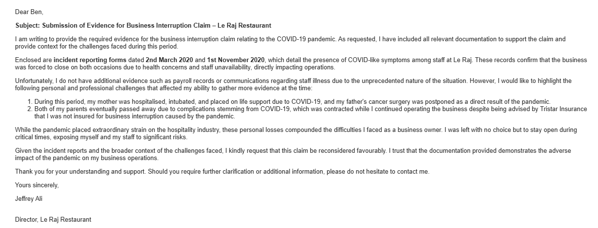 25th January 2025 – Email from the owner stating that they are enclosing incident reporting forms with COVID among staff, and that he does not have communications or payroll records. Both of his parents passed away due to COVID, which was contracted whilst the business kept going.