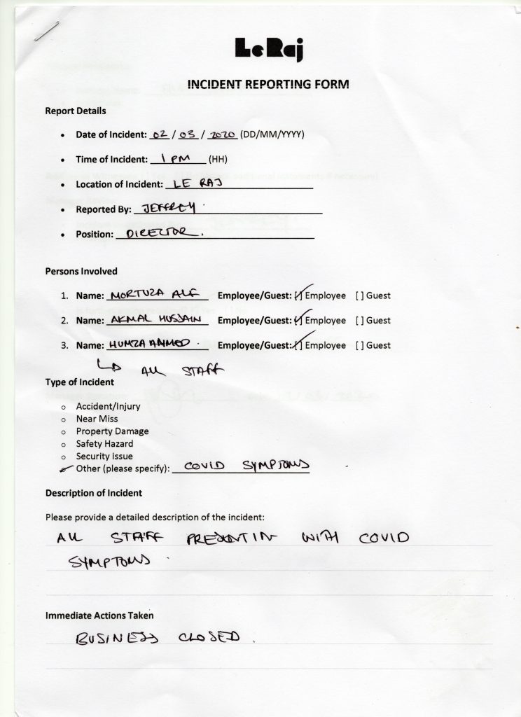 2nd March 2020 1PM – Three staff involved again in this incident reported, reported by the director. All staff presented with flu-like symptoms from COVID and the business immediately closed.